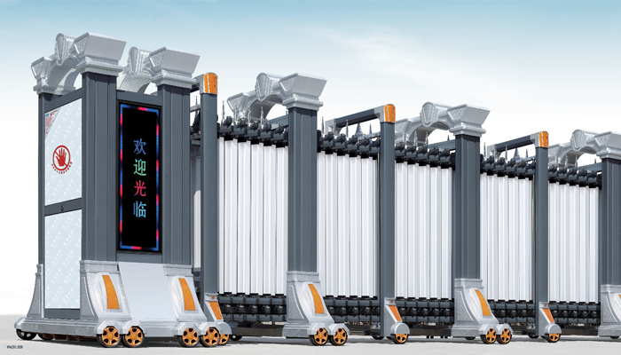 5.電動伸縮門體采用優(yōu)質(zhì)不銹鋼或鋁合金等材料制作,采用平行四邊形原理交接,伸縮靈活。驅(qū)動器采用特種電機驅(qū)動,蝸桿蝸輪減速,設(shè)有手動離合器,停電時可手動啟閉。